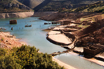 Es muss ein trockener Sommer gewesen sein in den Bergen von Kastilien. Der Wasserspiegel im Stausee von Mansilla ist auf die Hälfte abgesunken, hat hässliche Uferränder und selbst im Tageslicht gespenstisch wirkende Ruinen freigelegt. Abgesunken ist auch mein Leistungslimit. Schon auf der ersten ordentlichen Passhöhe, dem Collado el Manquillo (1416m) hatte Daniel über 20 Minuten warten müssen, bis ich herangekeucht komme. Trotzdem machen wir am nächsten Hotel, dem Venta de Goyo, nicht Halt. Der Ehrgeiz reicht noch bis Viniegra de Abajo, um die 100-Kilometer-Tagesration zu schaffen. In Unterviniegra wird allerdings die Quartiersuche etwas schwierig. Wir machen schließlich ein Wandererheim am Ortsrand ausfindig und besorgen den Schlüssel.