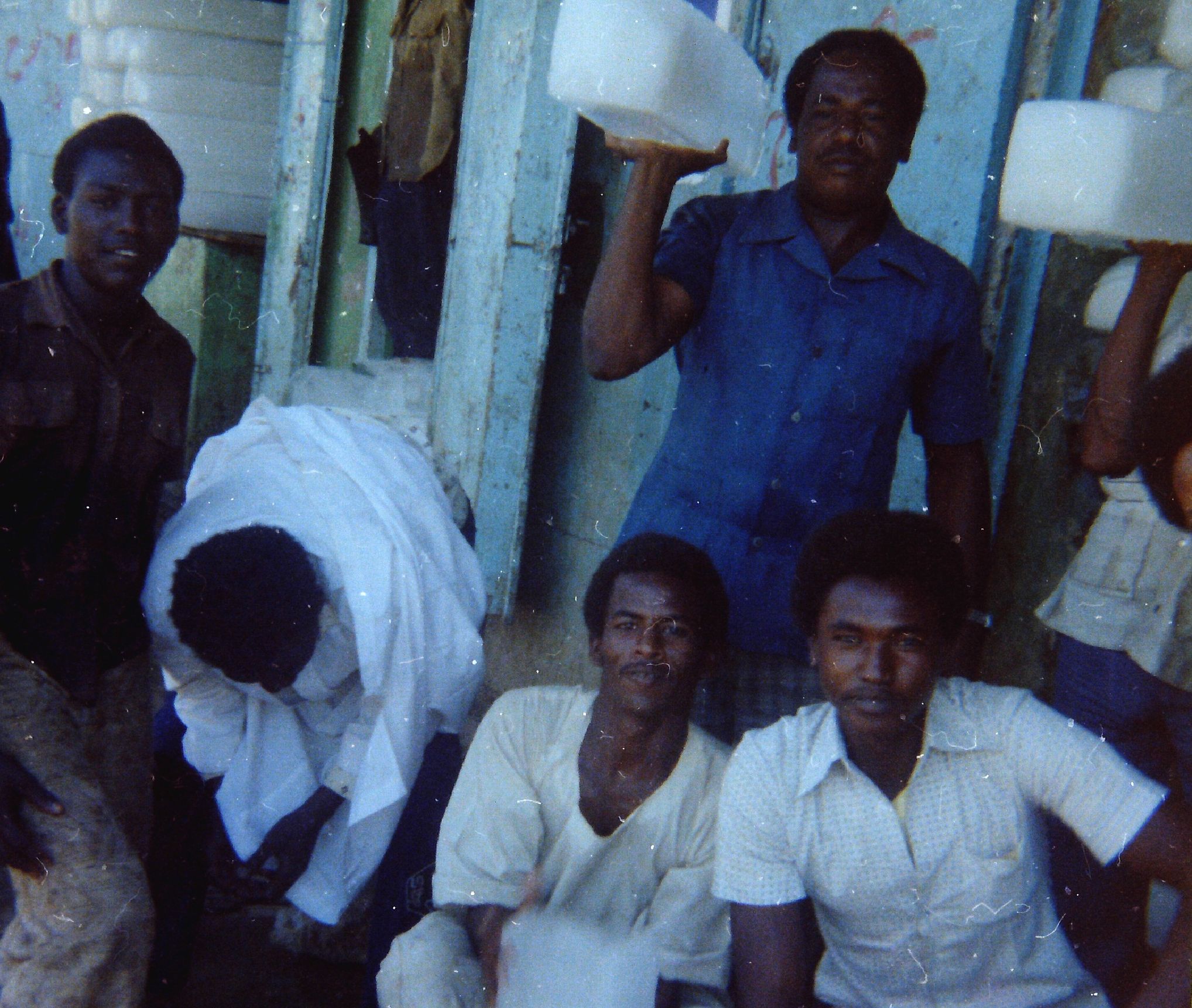 Meine Pocketkamera hat viel zu tun, da kommt ein besonders starkes Motiv ins Blickfeld. Ein paar Männer laden bahnschwellengroße Eisblöcke aus. Ich spreche sie an und will ein Foto machen. Na klar, sie stellen sich sofort in Positur. Aber ausgerechnet jetzt ist die Filmspule mit 20 Aufnahmen voll. Geduldig warten meine Models mit tapfer hochgestreckten Eisklötzen, bis ich gewechselt habe. Auf dem Rückweg spricht mich ein Mann aus Eritrea an, ein Flüchtling. Da ich aus Deutschland komme, bittet er mich, Kontakt mit einer Freundin aufzunehmen, die nicht weiß, wo er steckt, und gibt mir eine Adresse im Raum Frankfurt. Von dort werde ich später einen Brief mit der Nachricht erhalten, dass die Verbindung über mich zustandegekommen ist.