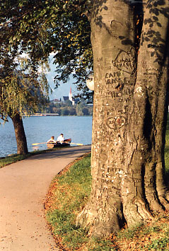 dem bekannten Ferienort mit alten Hotelkästen aus der Zeit der K.u.K. Monarchie. Vor den Kulissen an der Seepromenade dreht ein Kamerateam aus Österreich Szenen für einen historischen Film. Von hier kamen früher Ruder-Weltmeisterschaften im Fernsehen. Ich nehme das "Zimmer frei" in einem ziemlich neuen Haus, sie bevorzugen D-Mark oder Dollar.