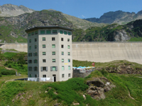 das Dorf ist besetzt von den Folgen eines Skulpturen-Symposiums. Die Albergo Pineta liegt ein paar Meter vor den aneinanderklebenden Steinhäusern.14.8. Fusio - RobieiDie ersten Kilometer laufe ich auf der Werkstraße zum Stauseee von Naret, dann über den ersten der in den nächsten Tagen zu überwindenden Pässe, den Passo del Naret (2438m). Den ganzen Tag begegnet mir niemand, außer einer Frau, die auch alleine durch die Berge stiefelt und etwas unsicher ist, den Weg zur Station Robiei zu finden. Das Hotel dort, einmal für die Arbeiter der Staumauern gebaut, liegt als sechskantiger, sechsstöckiger Fremdkörper an der Kette der künstlichen Bergseen. Während ich noch einen Platz im Massenlager finde, läuft auch die Wandersfrau ein und nimmt die Seilbahn ins Tal. In der Gaststube von ROBIEI