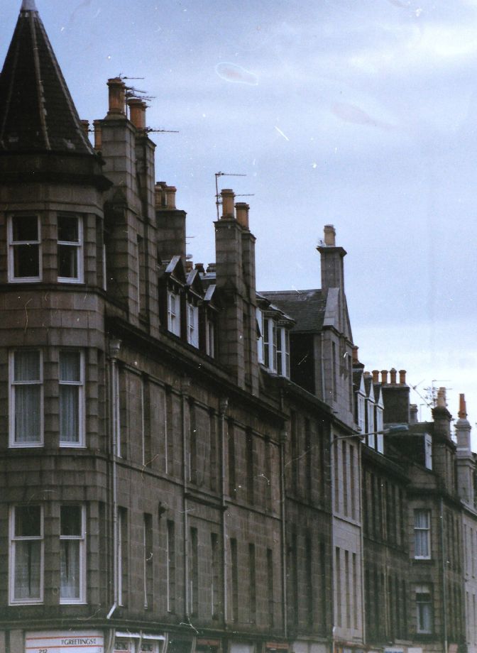 8.9. Noch einmal muss ich, auf Dundee zu, auf trotzig hoher Brücke einen windigen Meeresarm überqueren. Aber dann macht die Küstenstraße am Saum der Highlands für den Rest des abwechslungsarmen Tages keine Umstände mehr. Arbroath, Montrose, Stonehaven - und am Ende der 129 Kilometer Aberdeen, total mit grauem Schiefer bedeckt. Aberdeen, Kings Street