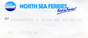Ich hätte mich gar nicht beeilen müssen. Einboarden ist erst am Abend. Laut Ticket der Reederei North Sea Ferries kommt der deutsche Fahrgast auf der M.V. "Norsun" aus "Wald zu Tingen".