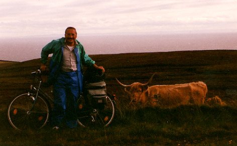 85 Kilometer liegen noch vor mir bis Thurso, zum nördlichsten Bahnhof von Schottland. 50 Kilometer vor dem nordöstlichsten Zipfel kommt mir einer entgegen. Mit voll aufgerüstetem Raddampfer, Gepäckwägelchen hintendran, beflaggt und behängt. In John o`Groates ist er gestartet und hat ganz Britannien bis zum südwestlichsten Zipfel in Cornwall, wo er mit dem Fahrrad hin will, noch vor sich. Dabei seien die ersten 50 Kilometer schon soo übel gewesen. Er gibt mir seine Kamera, damit ich ihn fotografiere, ich gebe ihm meine, damit er mich fotografiert.