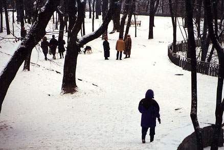 Zwei Tage später, am 21. Dezember, ein neuer Anlauf. Diesmal gelingt es mir tatsächlich, an einem zufällig geöffneten Schalterfenster in Svijatoshyn eine Art Rückfahrkarte zur zehnmal so weit entfernten Stadt Korosten zu ergattern. Bei dem Preis (etwa 3 Mark) spielt das keine Rolle, auch nicht, dass der aufgedruckte Betrag durchgestrichen und handschriftlich durch das Zehnfache korrigiert wird. Die richtige Richtung ist mir auch klar, also steige ich einfach beim nächsten Zug ein. Aber wo aussteigen? Ich wende mich an vermummte Gestalten im Waggon, indem ich den Namen Vorzel auf einen Zettel kritzle. Einer kann tatsächlich ungefähr hundertmal mehr englisch als ich russisch (ein Wort: spaciba. "Budka" zählt ja wohl nicht): three Stations! Da stehe ich also an einem Haltepunkt mit Eisentreppe über die Geleise und ein paar hinter Schnee und Eis versteckten Gebäuden. Eines sieht aus wie ein Kinderheim in den Winterferien. Eines sieht nicht nur so aus, sondern ist ein Kaufladen. Viel zu kaufen gibt es da allerdings nicht. Eine Stunde später fährt ohnehin wieder ein Zug zurück.